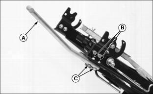 1. From bag of parts, install lift handle (A) under left frame rail with two M6 x 1.0 x 30 mm flange bolts (B), top-down, and fasten with two M6 x 1.0 flange nuts (C). Tighten two flange nuts to 17 N·m (150 lb-in.).