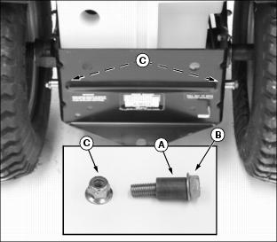 2. Install spacers and bolts in BOTTOM holes at rear of tractor frame and secure with M12 x 1.75 locknuts (C) on inside of tractor frame. Tighten locknuts to 105 N·m (78 ft-lb).
