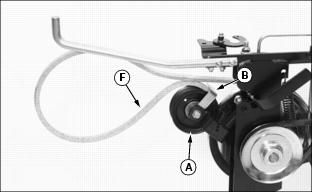 4. Remove shipping tape from belt and route belt between belt guide (B) and idler sheave (A) so small V-edge (F) is facing belt guide.