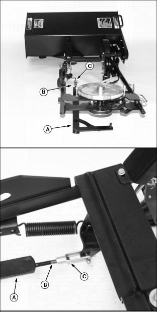 Turn threaded end (B) of tiller lift rod (A) clockwise into clevis (C), far enough so three-to-four threads are exposed inside clevis.
