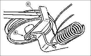 5. Adjust the position of belt guide (B) as shown. Make sure belt guide does not contact idler sheave at (G).