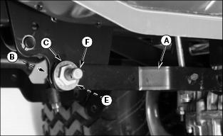 3. Install original washers (C) on tiller mounting pins (F), from bag of parts, then install in draft arms, spacers, and mounting brackets. Fasten with original locknuts (B) on inside of mounting brackets. Tighten locknuts to 140 N·m (103 lb-ft).