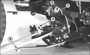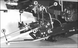 1. Move to right side, under tractor footrest-as you rotate tiller lift rod (B) upright, align tractor lift link (A) so pin (C) fits into hole (D) of lift link (A).