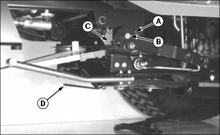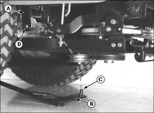 5. Swing belt tensioning lever (D) toward rear of tractor to tighten belt.