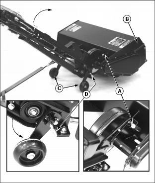 3. Pivot left-side frame support rod (C) upward so loop in rod is under mounting pin (D) of tractor frame.
