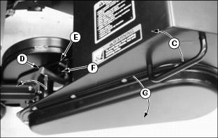 IMPORTANT: Avoid damage! Check that belt tensioning idler spring (G) is installed in top detent of belt tensioning lever (D). Damage to spring may occur or tensioning of idler may not apply proper tension on drive belt if spring is installed in the lower detent.