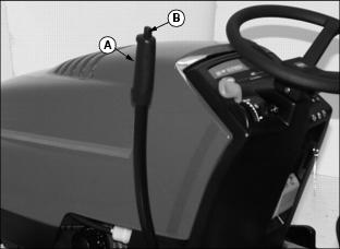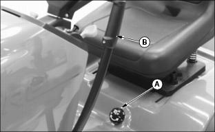 1. First pull implement lift lever (A) rearward slightly, then depress and hold down button (B) to unlock lift lever locking mechanism.