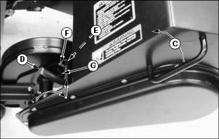 3. Move to left side of tiller housing-grasp handle (C) to raise tiller housing to align transport locking pin (D) and transport bracket locking hole (E). Rotate transport locking pin (D) reward to unlock rolled pin (F) from frame slot (G) and release transport locking pin so it springs into "LOCK-OUT" position in transport bracket locking hole (E).