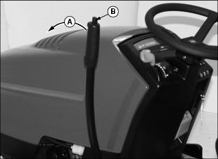 2. Push lift lever (A) out of "RAISE" position, release button (B) and lift lever. Lift lever is now in "FLOAT" position (between "RAISE" and "LOWER" positions).