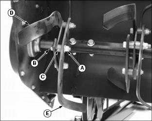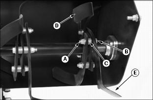 · Right Tine Set: Remove lock nuts (A), bolts (B), spacer (C), two left tines (D), and two right tines (E). Remember to install new bolts so heads are to right side and new lock nuts are to left side. A total of two spacers are used in this set.