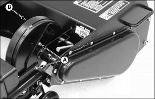 1. Move to left side of tiller housing-remove two self-tapping cap screws (A) and belt shield (B).