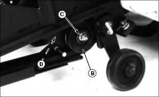2. Move to left rear of tiller-install V-idler (B) inside belt and fasten with mounting bolt (C), outside-in, and tighten with lock nut (D) on inside of frame.