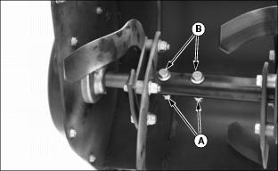 1. Move to left side of tiller shaft-remove lock nuts (A) and bolts (B).