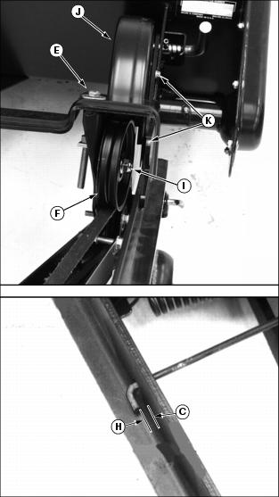 · To loosen belt-turn bolt (G) clockwise until a 3mm (1/8 in.) clearance exists between inside edge of rod end (H) and vertical frame rail (C).