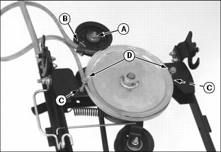 3. Loosen top jam nuts (C), one on each side, to tilt guide bolts (D) away from drive sheave.