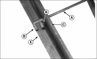 · If rod end is in position (D), extends beyond horizontal frame rail (E), the belt is too loose and must be tightened.