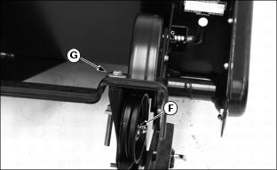 3. Turn bolt (E) counterclockwise to move tensioning idler (F) as far down in slot as necessary to tension belt properly-until inside-edge of front gauge rod (G) has 3 mm (1/8 in.) clearance from vertical frame rail (H).