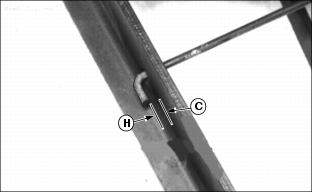 · To tighten belt-turn bolt (G) counter-clockwise until a 3 mm (1/8 in.) clearance exists between inside edge of rod end (H) and vertical frame rail (C).