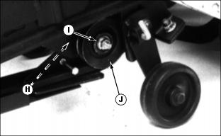 6. Move to left rear of tiller-remove lock nut (H) on inside of frame from idler mounting bolt (I) to remove V-idler (J) from inside of belt.