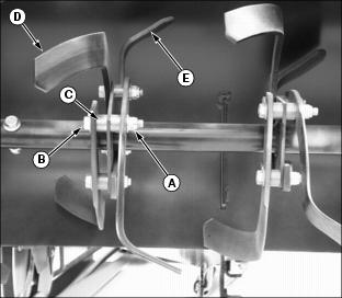 · MiddleTine Sets: Remove lock nuts (A), bolts (B), spacers (C), two left tines (D), and two right tines (E). Remember to install new bolts so heads are to left side and new lock nuts are to right side. A total of eight spacers are used in these middle tine sets-four in each set.