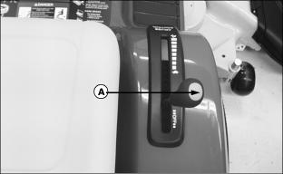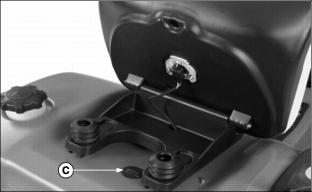 4. If oil is low, add SAE 10W30 engine oil to bring oil level to the FULL line. · Clean around reservoir filler cap (C). · Remove foam filter in oil reservoir neck. · Add oil to bring oil level between ADD and FULL line. · Install and tighten oil fill cap. 6. Operate tractor forward and in reverse several times. 7. Park tractor on level surface. Stop engine and check oil level again. Adjusting Cruise Control Lever TensionNOTE: The friction mechanism that holds the cruise control lever in position was pre-set at the factory. This mechanism may require adjustment due to wear or operator preference. 1. While operating tractor, move cruise control lever (A). Decide if lever tension should be increased or decreased. Picture Note: Right wheel removed for photo clarity only. 2. Locate M8 adjusting nut (B) (13 mm wrench) in right wheel well. Adjustment can be easily made without removing right wheel. NOTE: A backing wrench on the opposite (inside) end of bolt is not required. 3. Turn nut (B) to adjust cruise control lever tension: · Increase tension, turn nut clockwise. · Decrease tension, turn nut counterclockwise. Adjust tension, so that lever can be easily stroked in both forward and rearward direction. Lever should hold transmission linkage in any position desired. |