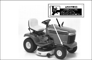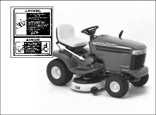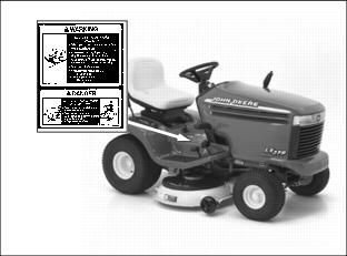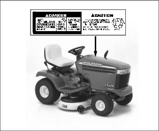 SafetyUnderstanding The Machine Safety LabelsThe machine safety labels shown in this section are placed in important areas on your machine to draw attention to potential safety hazards. On your machine safety labels, the words DANGER, WARNING, and CAUTION are used with this safety-alert symbol,. DANGER identifies the most serious hazards. The operator's manual also explains any potential safety hazards whenever necessary in special safety messages that are identified with the word, CAUTION, and the safety-alert symbol,. Machine Safety LabelsWARNING: AVOID SERIOUS INJURY OR DEATH· Drive up and down slopes, not across · If machine stops going uphill, stop blade and back down slowly · Keep safety devices (guards, shields, and switches) in place and working DANGER: ROTATING BLADES CUT OFF ARMS AND LEGS· Do not mow when children or others are around · Look down and behind before and while backing · Never carry children even with blades off WARNING: LOADED SPRINGPicture Note: Two Decals, One on Each Side of Tractor Frame. LOCK LIFT LEVER FORWARD BEFORE CHANGING ATTACHMENTS DANGER:Picture Note: Located on Battery KEEP OUT OF REACH OF CHILDREN. KEEP VENT CAPS TIGHT AND LEVEL. Emission Control System Certification LabelNOTE: Tampering with emission controls and components by unauthorized personnel may result in severe fines or penalties. Emission controls and components can only be adjusted by EPA and/or CARB authorized service centers. Contact your John Deere Commercial and Consumer Equipment Retailer concerning emission controls and component questions. The presence of an emissions label signifies that the engine has been certified with the United States Environmental Protection Agency (EPA) and/or California Air Resources Board (CARB). The emissions warranty applies only to those engines marketed by John Deere that have been certified by the EPA and/or CARB; and used in the United States and Canada in off-road mobile equipment. Emission Compliance PeriodIf your engine has the emission compliance category listed on the emission control system certification or air index label, this indicates the number of operating hours for which the engine has been certified to meet EPA and/or CARB emission requirements. The following table provides the engine compliance period in hours associated with the category found on the certification label. Operating Safely· Inspect machine before you operate. Be sure hardware is tight. Repair or replace damaged, badly worn, or missing parts. Be sure guards and shields are in good condition and fastened in place. Make any necessary adjustments before you operate. · Check brake action before you operate. Adjust or service brakes as necessary. · Stop machine if anyone enters the area. · If you hit an object, stop the machine and inspect it. Make repairs before you operate. Keep machine and attachments properly maintained and in good working order. · Do not leave machine unattended when it is running. · Only operate during daylight or with good artificial light. · Be careful of traffic when operating near or crossing roadways. · Do not wear radio or music headphones while operating the machine. Safe operation requires your full attention. · Older adults are involved in a large percentage of riding mower accidents involving injury. These operators should evaluate their ability to operate a mower safely enough to protect the operator and others from serious injury. Checking Mowing Area· Clear mowing area of objects that might be thrown. Keep people and pets out of mowing area. · Study mowing area. Set up a safe mowing pattern. Do not mow where traction or stability is doubtful. · Test drive area with mower lowered but not running. Slow down when you travel over rough ground. Parking Safely1. Stop machine on a level surface, not on a slope. 3. Lower attachments to the ground. 7. Wait for engine and all moving parts to stop before you leave the operator's seat. Rotating Blades are DangerousHELP PREVENT SERIOUS OR FATAL ACCIDENTS:· Rotating blade can cut off arms and legs. · Keep hands, feet and clothing away from mower deck when engine is running. · Be alert at all times, drive forward carefully. People, especially children can move quickly into the mowing area before you know it. · Before backing up, shut off PTO and look behind the machine carefully, especially for children. · Shut off blades when you are not mowing. · Do not operate machine if you are under the influence of drugs or alcohol. · Park machine safely before inspecting or unplugging mower or bagger. PROTECT CHILDREN:· Never assume that children will remain where you last saw them. Children are attracted to mowing activity, stay alert to the presence of children. · Keep children indoors when you are mowing. Turn the machine off if a child enters the mowing area. · Use extra care when you come to blind corners, shrubs, trees, or other objects that may block your vision. · Do not let children or an untrained person operate the machine. · Do not carry or let children ride on any attachment or machine even with the blades off. Do not tow children in a cart or trailer. Avoid Tipping· Do not drive where machine could slip or tip. · Stay alert for holes and other hidden hazards in the terrain. · Slow down before you make a sharp turn or operate on a slope. · Limit loads to those you can safely control. Use only approved hitches when pulling loads or using heavy equipment. Use counterweights or wheel weights as required in this manual or your attachment manual. · Use wheel weights for added stability when operating on slopes or using rear mounted attachments. · Drive up and down a hill - not across. Be careful when you change direction on a slope. · Do not stop when going up hill or down hill. If machine stops going up hill, disengage mower blades and back down slowly. · Mowing when grass is wet can cause reduced traction and sliding. · Do not try to stabilize the machine by puttin