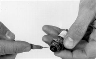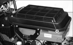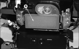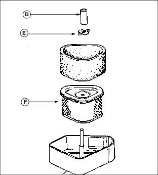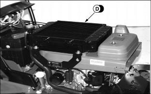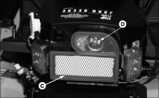 1. Park machine safely. (See Parking Safely in the Safety Section.) 3. Clean engine screens and external surfaces with rag, brush, vacuum or compressed air. · Air intake screen (A), cooling fins and external surfaces (B). Air intake screen (C). When operating in extremely dirty conditions, remove air intake screen and clean radiator screen (D). Checking and Cleaning Air Cleaner Elements (Kohler 13hp or 15hp Engines)1. Park machine safely. (See Parking Safely in the Safety Section.) 4. Clean dirt and debris from the air cleaner cover. 5. Loosen knob (A) to remove air cleaner cover (B). 6. Inspect the foam precleaner without removing it. If the foam precleaner (C) is dirty: · Remove it from the filter carefully, leaving the paper element in the air cleaner housing. · Wash precleaner in a solution of warm water and liquid detergent. · Rinse precleaner thoroughly. Squeeze out excess water in a dry cloth until precleaner is completely dry. · Put approximately 30 ml. (1 oz.) of clean engine oil onto the precleaner. Squeeze precleaner to distribute the oil evenly. Squeeze out excess oil with a clean cloth. 7. Inspect the paper element without removing it. If the paper element (F) is damaged dirty: · Remove rubber tube sleeve (D) and wing nut (E). · Carefully remove the element from the air cleaner housing. Replace with a new element. 8. Clean air cleaner base very carefully, preventing any dirt from falling into carburetor. 9. Install foam precleaner onto paper element and install into air cleaner base. 10. Install and tighten wing nut. 11. Install rubber tube sleeve on post. Then push it down tight against wing nut. 12. Install air cleaner cover and tighten knob. DO NOT overtighten. Checking and Cleaning Air Cleaner Elements (Kawasaki Air Cooled, 17hp Engine)1. Park machine safely. (See Parking Safely in the Safety Section.) 4. Unhook latches (A) on both sides of cover and remove cover. 5. Inspect the foam precleaner without removing. If the foam precleaner (B) is dirty: · Remove it from the filter carefully, leaving the element in the air cleaner housing. · Wash precleaner in a solution of warm water and liquid detergent. · Rinse precleaner thoroughly. Squeeze out excess water in a dry cloth until precleaner is completely dry. · Put approximately 30 ml. (1 oz.) of clean engine oil onto the precleaner. Squeeze precleaner to distribute oil evenly. Squeeze out excess oil with a clean cloth. 6. Inspect the filter element without removing it. If the filter element (C) is damaged or dirty: · Carefully remove the element from the air cleaner housing. 7. Clean air cleaner base very carefully, preventing any dirt from falling into carburetor. 8. Install foam precleaner (B) and new filter element (C) onto post in air cleaner housing and tighten wing nut. 9. Replace cover and attach latches to body. Checking and Cleaning Air Cleaner Elements (Kawasaki Liquid Cooled, 17hp Engine)1. Park machine safely. (See Parking Safely in the Safety Section.) Picture Note: Hood removed for photo clarity only. 4. Remove air intake screen (A). 5. Remove two thumb screws and washers (B) and remove cover. 6. Inspect foam precleaner without removing it. If the foam precleaner (C) is dirty: · Remove it from the filter carefully, leaving the paper element in the air cleaner housing. · Wash precleaner in a solution of warm water and liquid detergent. · Rinse precleaner thoroughly. Squeeze out excess water in a dry cloth until precleaner is completely dry. · Put approximately 30 ml. (1 oz.) of clean engine oil onto the precleaner. Squeeze precleaner to distribute oil evenly. Squeeze out excess oil with a clean cloth. 7. Inspect the paper element without removing it. If the paper element (D) is damaged or dirty, carefully remove the element from the air cleaner housing. 8. Carefully clean air cleaner housing. Prevent any dirt from falling into carburetor. 9. Install foam precleaner and new paper element onto post in air cleaner housing. 10. Install air cleaner cover. Install washers and tighten two thumb screws. Checking and Cleaning Air Cleaner Elements (Briggs and Stratton 16hp or 18hp Engines))1. Park machine safely. (See Parking Safely in the Safety Section.) Picture Note: Hood removed for photo clarity only. 4. Unhook latches (A) on both sides of cover and remove cover. 5. Inspect the foam precleaner without removing it. If the foam precleaner (B) is dirty: · Remove it from the filter carefully, leaving the paper element in the air cleaner housing. · Wash precleaner in a solution of warm water and liquid detergent. · Rinse precleaner thoroughly. Squeeze out excess water in a dry cloth until precleaner is completely dry. · Put approximately 30 ml. (1 oz.) of clean engine oil onto the precleaner. Squeeze precleaner to distribute the oil evenly. Squeeze out excess oil with a clean cloth. 6. Inspect the paper filter element without removing it. If the paper filter element (C) is damaged or dirty: · Remove knob (D) and plate (E). · Carefully remove the element from the air cleaner housing. 7. Clean air cleaner base very carefully, preventing any dirt from falling into carburetor. 8. Install new paper filter element, plate and knob. 9. Install foam precleaner on paper filter element. 10. Replace cover and attach clips to body. Checking Spark Plug1. Park machine safely and lift hood. (See Parking Safely in the Safety Section.) 2. Disconnect spark plug wire(s) (A). 4. Clean spark plug carefully with a wire brush. · Pitted or damaged electrodes. NOTE: In Canada, replace spark plug with resistor plug only. 6. Replace spark plug as necessary. 7. Check plug gap with a wire feeler gauge. · To change gap, move the outer electrode. 8. Install and tighten spark plug. 9. Connect the spark plug wire and lower hood. Service Cooling System SafelyEngine CoolantThe following John Deere coolant is preferred for both Diesel and Gasoline engines with aluminum blocks and cooling systems. Read and follow all instructions list