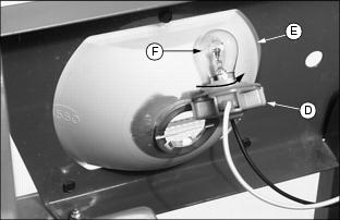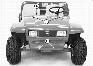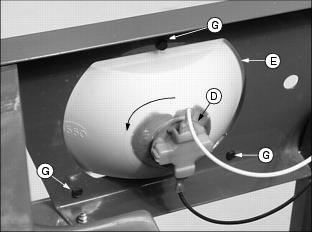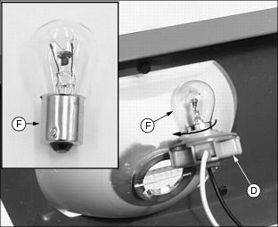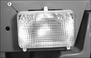 1. Install new headlight bulb (F) into bulb socket (D). ˇ Push down top of bulb and rotate clockwise into a locked position. 2. Install bulb socket (D) into headlight housing (E). ˇ Rotate bulb socket clockwise into a locked position. 3. Install hood (A) onto vehicle. ˇ Install and tighten top two screws (B). ˇ Push hood upward. Allow equal clearance around each headlight housing. ˇ Install and tighten two bottom screws (B). Replace Headlight Housing2. Rotate bulb socket (D) counterclockwise approximately 1/3 turn and remove from headlight housing (E). 3. Remove screws (G) securing headlight housing to the utility vehicle frame. 4. Install replacement headlight housing (E). ˇ Attach housing to utility vehicle frame with screws (G). 5. Install bulb socket (D) into headlight housing. |