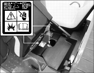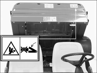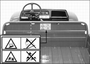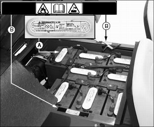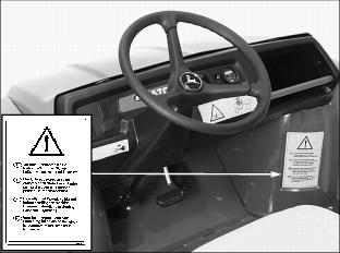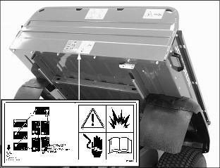 SafetyPictorial Safety SignsAt several important places on this machine safety signs are affixed intended to signify potential danger. The hazard is identified by a pictorial in a warning triangle T. An adjacent pictorial provides information how to avoid personal injury. These safety signs, their placement on the machine and a brief explanatory text are shown in this Safety Signs section. Machine Safety LabelsCAUTIONWARNINGˇ Maximum of one person to a seat. ˇ No riders in box or anywhere else. ROLLOVER OR FALLING OFF MAY CAUSE DEATHˇ Drive very slowly when turning. ˇ Always use brakes going down a slope. Vehicle can take-off (freewheel) downhill. ˇ No loads heavier than 500 lbs (227 kg) in vehicle cargo box. Spread load evenly. Tie loads down. ˇ Reduce speed and load on rough or hilly ground. DANGERˇ Turn key off, place FORWARD/REVERSE lever to Neutral (N) and remove key. ˇ Place SERVICE switch in SERVICE position. ˇ Never disconnect a circuit under load at a battery terminal. ˇ Remove all jewelry (rings, watches etc.). ˇ Disconnect batteries, as shown, to avoid unintentional starting of vehicle. Pay close attention to polarities when connecting batteries. Always connect the red end of the cable to the positive (+) post and the black end of the cable to the negative (-) post. WARNINGˇ Young drivers may not be able to control vehicle. ˇ No drivers younger than 16 years old. Read Operator's ManualCarefully read Operator's Manual before handling the machine. Observe instructions and safety rules when operating. DANGER/POISONPicture Note: Raise cargo box to locate battery safety information. English DANGER/POISON information (A) molded into battery caps. No-text DANGER/POISON labels (B) are located on each vehicle frame side rail. Cigarettes, flames or sparks could cause the batteries to explode. Always shield eyes and face from the batteries. Do not charge or use booster cables or adjust poor connections without proper instruction and training. Keep vent caps tight and level. Contains sulfuric acid. Avoid contact with skin, eyes or clothing. In event of an accident, flush with water and call a physician immediately. Keep out of reach of children. DANGERPicture Note: Lift operator seat to locate safety labels. Place switch in SERVICE position before servicing batteries or when towing. Do not tow in excess of 15 m.p.h. (24 km/h) or motor may rupture or disintegrate. CAUTIONˇ Operate dump with machine stationary and parking brake locked: Never dump while moving. ˇ Operate dump on level ground only. ˇ Do not place hands behind seat when lowering box. ˇ Refer to operator's manual for correct load distribution. CAUTIONFor emergency stopping, raise the park brake lever. CE LabelThis label is part of the utility vehicle identification plate on your utility vehicle. It indicates that your vehicle model has been certified and is in compliance with European Directive 89/392/EEC Standards. Battery Charger Safety LabelCAUTIONEngage connector fully for proper charging. Battery Charger Safety InformationNOTE: Battery charger safety information inscribed on top and front of battery charger housing. Information-Front of ChargerStudy instruction sheet before charging. Switch off mains supply before connecting or disconnecting charger output plug. To ensure protection against electric shock, connect only to a socket-outlet with earthing contact. ˇ Explosive gases - prevent flames and sparks. ˇ Charge lead-acid batteries only in well ventilated area. ˇ This battery incorporates parts such as switches and relays that are likely to produce arcs or sparks; therefore, when charging a battery in a garage or similar location, locate the battery charger in a room or enclosure provided for this purpose. ˇ Disconnect from mains and output circuit before removing cover. Information - Top of Charger