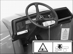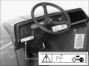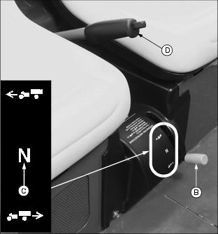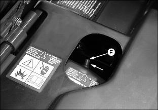 ˇ Never cross any body of water where depth may be unknown to the operator. As an operational guideline, deep water is considered anything in excess of 152mm (6 in.) in depth. Tires may float, making it difficult to maintain control. ˇ Choose a course within the waterway where both banks have a gradual incline. Cross at a point known to be safe. ˇ Proceed at a slow steady speed to avoid submerged obstacles and slippery rocks. ˇ Avoid water crossings where the operation of a utility vehicle may cause damage to waterway beds or erode waterway shoreline. Practice Safe Maintenanceˇ Understand service procedure before doing work. Keep area clean and dry. ˇ Never lubricate, service, or adjust vehicle while it is moving. Keep safety devices in place and in working condition. Keep hardware tight. ˇ To prevent them from getting caught, keep hands, feet, clothing, jewelry, and long hair away from any moving parts. ˇ Turn key switch to the OFF "0" position. ˇ Move directional control lever to the NEUTRAL "N" position. ˇ Move service/drive switch to the SERVICE position. ˇ Securely support any vehicle elements that must be raised for service work. ˇ Never support the vehicle in a raised position and run the motor. ˇ Keep all parts in good condition and properly installed. Fix damage immediately. Replace worn or broken parts. Remove any buildup of grease, oil, or debris. ˇ Disconnect battery set positive (B+) cable before servicing the electrical systems. ˇ Unauthorized modifications to the vehicle may impair its function and safety. Use Care In Handling and Servicing BatteriesPrevent Battery Explosionsˇ Batteries contain sulfuric acid and produce explosive mixtures of hydrogen. Because hydrogen gas is present even when the utility vehicle is not in operation, make sure batteries are stored and serviced in a well ventilated area. ˇ Always wear proper eye, face and hand protection. ˇ Keep sparks, lighted matches, and open flame away from the top of battery. ˇ Remove all jewelry (watches, rings, bracelets, etc.) before servicing the electrical system or batteries. ˇ Make sure work area is well ventilated. ˇ Never lean over battery while testing or charging. ˇ Keep removable vents tight and level except when servicing electrolyte. ˇ Exercise caution while working with tools or conductors to prevent short circuits and sparks. ˇ Never check battery charge by placing a metal object across the posts. Use a battery tester, voltmeter or hydrometer. ˇ DO NOT charge a frozen battery; it may explode. Warm battery to 16°C (60°F). Charging Safetyˇ Never attempt to charge a battery set without first reviewing the instructions provided with the charger. ˇ Use only the battery charger provided with the utility vehicle. DO NOT use substitutes. ˇ Always wear proper eye, face and hand protection. ˇ Keep sparks, lighted matches, and open flame away from the top of battery. ˇ Make sure work area is well ventilated. ˇ Never lean over battery while testing or charging. ˇ Keep removable vents tight and level except when servicing electrolyte. ˇ To avoid dangerous sparks, make sure the charger AC plug is disconnected before disconnecting the DC plug to the vehicle receptacle. ˇ Never try to charge a visibly damaged or frozen battery. ˇ Be sure that the key switch and all electrical accessories are turned off. ˇ Make sure the charger leads are not broken, frayed or loose. ˇ If the battery becomes hot, or if violent gassing or spewing of electrolyte occurs, unplug the charger AC source first before removing the DC plug. ˇ If battery set is on charge, unplug the charger AC plug before disconnecting the charger DC cable plug to avoid dangerous sparks. Prevent Acid BurnsUse extreme caution when handling electrolyte. Sulfuric acid in battery electrolyte is poisonous. It is strong enough to burn skin, eat holes in clothing, and cause blindness if splashed into eyes. ˇ Filling batteries in a well-ventilated area. ˇ Wearing eye and face protection, a rubber apron and rubber gloves. ˇ Avoid breathing fumes when water is added. ˇ Avoid spilling or dripping electrolyte. ˇ Flush area of the body that has been exposed with water for at least 20 minutes. ˇ Flush your eyes with clean, cool water for at least 20 minutes. ˇ Remove contaminated clothing. ˇ Get medical attention immediately. ˇ Drink large amounts of water or milk. DO NOT induce vomiting. ˇ Then drink milk of magnesia, beaten eggs, or vegetable oil. ˇ Get medical attention immediately. Using High Pressure WashersDirecting pressurized water at electronic/electrical components or connectors, bearings, or other sensitive parts and components may cause product malfunctions. Reduce water pressure if pressurized spray is used to clean the batteries and surrounding areas. Wear Appropriate Clothingˇ Wear close fitting clothing and safety equipment appropriate for the job. ˇ Loud noise can cause impairment or loss of hearing, wear a suitable protective device such as earplugs. ˇ Do not wear radio or music headphones while servicing the machine. Safe service requires your full attention. Handling Waste Product and Chemicalsˇ Waste products such as batteries, can harm the environment and people. ˇ DO NOT use beverage containers for waste fluids - someone may drink from them. ˇ See your local Recycling Center or John Deere dealer to learn how to recycle or get rid of waste products. Service Utility Vehicle SafelyNOTE: The charger DC cable plug must be removed from the vehicle receptacle. 1. Turn key switch to the OFF "0" position (A). 2. Move directional control lever (B) to the NEUTRAL "N" position (C). NOTE: Turn off all vehicle electric accessories. 5. Raise and tilt operator seat forward. ˇ Move the service/drive switch (E) to the SERVICE position. |