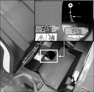 Using a Hydrometer1. Park vehicle safely. (See Park Safely in the Safety section.) 2. Move the service/drive switch (A) to the SERVICE position. 4. Lift and secure cargo box in the raised position. 5. Inspect battery terminals, boots and case for breakage, cracks, hot spots or discoloration. Repair as needed. 6. Refer to the battery test log and prepare to record pertinent hydrometer test information. (See Battery Test Log in this section.)