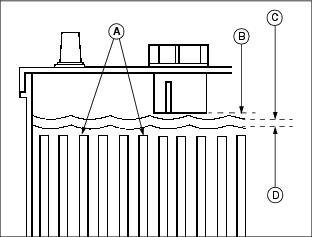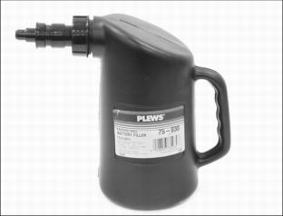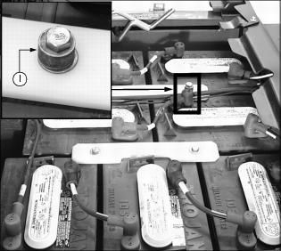 · Tighten each terminal connection hex nut (E) to 5. Replace the proper terminal boots (C) (red on positive, and black on negative) securely over each battery terminal. NOTE: Spacer (I) must be installed under the head of the front left battery hold down bolt with standard T105 batteries only. Use of the spacer will allow the battery to be properly installed and the hold down bolt to be accurately torqued. 6. Install battery hold down (s). · Torque hold down bolts to 7-9 N·m (62-80 lb.-in.). 7. Check the electrolyte level in each battery cell. Checking Battery Electrolyte LevelsChecking and maintaining electrolyte levels is important to the care and life of the batteries. Improper care of the batteries can lead to premature battery failure due to cell dilution and imbalance. Electrolyte levels drop during discharge and rise during charging. Therefore, it is essential that the electrolyte levels be checked: · After each week the vehicle is used. · At the recommended service interval if the vehicle is in storage. (Refer to the Service Interval Chart section.) NOTE: To maintain specific gravity balance, battery fluid levels should be the same in all 24 battery cells. Battery Electrolyte GuidelinesNOTE: Overfilling or underfilling the batteries will void vehicle and battery warranties. · It is recommended that distilled water be used for filling battery cells. If distilled water is unavailable, any water safe for drinking (except mineral water) can be used. Water that is not distilled should be analyzed. Make sure that the mineral contents of the water used are below those listed in the following table. · If the electrolyte level is low, add water near the end of the charge cycle or after taking the battery off charge. Never allow the electrolyte level to drop below the tops of the plates (A) because the exposed portion of the plates will become permanently inactive due to sulfation. · Never overfill a battery cell above the battery cap level indicator (B). Overfilling the batteries will result in electrolyte loss through the vent caps. This provides a path for self discharge of the battery and also causes corrosion problems. · Batteries will need to be watered more often: · Note any large differences in the amount of water needed from cell to cell. All battery cells should gas approximately the same amount, large differences may indicate a defective cell. Automatic Watering DevicesNOTE: The automatic battery filler must be ordered separately from your John Deere dealer. An automatic battery filler container can be used to maintain the correct electrolyte level within the battery cells. This 1.9 L (2 qt) professional battery filler shuts off automatically when battery cells are properly filled. Checking Electrolyte Level-Before Charging1. Park vehicle safely. (See Park Safely in the Safety section.) 3. Lift and secure cargo box in the raised position. 4. Check battery electrolyte level. · Carefully remove the battery cap. Look into each cell to see if the electrolyte level is above the top of the plates.