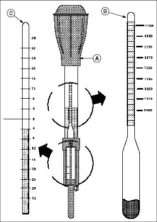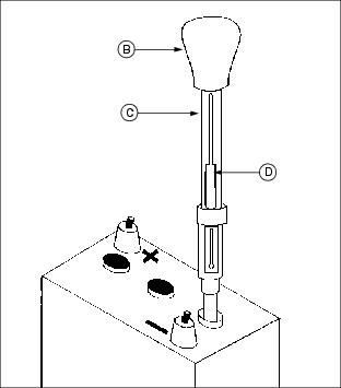 · If the electrolyte level is low, add only enough water to bring the electrolyte to the MAXIMUM level (C). · If the electrolyte level is at the MAXIMUM level, DO NOT add any water. 6. Repeat battery electrolyte level check for each vehicle battery. Checking Battery ConditionIf the vehicle is not performing satisfactorily, and it is suspected to be battery related, test the battery set and determine battery condition. An effective way to identify the cause of a poorly performing battery is to perform a hydrometer test. Using a hydrometer will identify a battery in a set with a lower than normal specific gravity. Once the particular cell or cells that are the problem are identified, the suspect battery can be removed and replaced. HydrometerNOTE: The hydrometer must be ordered separately from your John Deere dealer. · The state-of-charge of a lead acid battery can be determined by the specific gravity of the electrolyte (its weight compared to water). The specific gravity can be measured directly with a hydrometer (A). · A hydrometer is a bulb-type syringe which will extract electrolyte from a battery cell. A glass float (B) in the hydrometer barrel is calibrated to read in terms of specific gravity. · The range of specific gravity used on these floats is 1.140 to 1.325. · DO NOT assume a battery will not take a charge because you have been charging it for a while and the float will not rise. The battery may have been fully discharged and will require considerable charging before reaching the minimum specific gravity on the float. · The lower the float sinks in the electrolyte, the lower its specific gravity. · Hydrometer floats are calibrated to give a true reading at one fixed temperature only. The hydrometer is equipped with an internal thermometer (C) that will measure the temperature of the electrolyte and will include a conversion scale to correct the float reading. · A correction factor must be applied for any specific gravity reading made when the electrolyte temperature is not 26.7°C (80°F). A temperature correction must be used because the electrolyte will expand and become less dense when heated. The float will sink lower in the less dense solution and give a lower specific gravity reading. The opposite occurs if the electrolyte is cooled. It will shrink in volume, becoming more dense. The float will rise higher and give a false high reading. · A correction factor of 0.004 specific gravity (sometimes referred to as 4 "points of gravity") is used for each 5.5° (10°F) change in temperature. Four "points of gravity" (0.004) are added to the indicated reading each 5.5°C (10°F) increment above 26.7°C (80°F) and four points are subtracted for each 5.5°C (10°F) below. This correction is important at temperature extremes because it can be a substantial value.