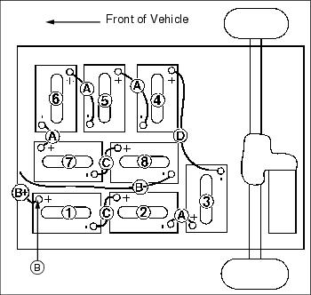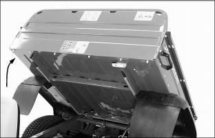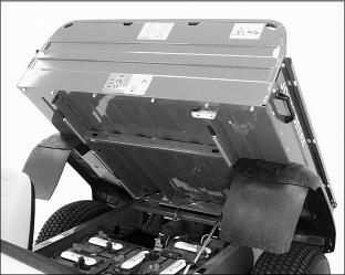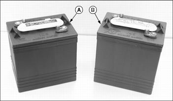 ServiceBattery SafetyUsing Deep Cycle BatteriesA - Standard Battery Type (Trojan T105) B - Optional Battery Type (Trojan T145) A cycling battery has a service requirement which is quite different than that of an automotive battery. The automotive battery must deliver high cranking currents at a satisfactory voltage for a few seconds and a portion of the accessory load (10-25 amperes) for a minute or two at a time in city or heavy traffic. Therefore, the automotive battery is designed with maximum plate area and low internal resistance to provide high cranking performance. Power taken from this battery is immediately replaced by the alternator or generator. Therefore, the battery is subjected to shallow discharge cycles (2-3% of the battery capacity). These batteries operate in the 90-100% state of charge. Cycling batteries supply all the motive power and power for the accessories for the vehicles in which they are used. The rate of discharge varies with the type of service. In electric vehicle service, the battery normally provides a nominal intermittent discharge of 75 amperes, with a typical range of 40-350 amperes. The depth of discharge varies with the length of time it is used before being recharged. Once the battery is discharged, it must be recharged to continue operating the vehicle. The batteries used in this utility vehicle usually receive "deep" discharge (60% or more of their capacity). NOTE: New cycling batteries do not have their full capacity until they have been cycled several times (usually between 20 and 50 cycles). Therefore, they can be excessively discharged early in their vehicular life, thereby shortening their service life. Cycling batteries are designed to have good life performance in "deep" cycle service. The major cause of battery failure in "deep" cycle service is poor maintenance: · Dirt or corrosion on battery tops or terminals. · Water too much or too little. · Excessive discharge (lack of charging). A battery is a perishable item that requires periodic maintenance. With a reasonable amount of care, the life of a battery can be significantly extended. The life of a cycling battery is determined not only by the number of cycles (a discharge and recharge) it receives, but also by the depth of each cycle. Assume a set of batteries is used four hours per day; lets call that one cycle. If they are used for eight hours, this is a much deeper discharge and is equivalent to approximately three cycles. A battery set used eight hours per day has a life span approximately one-third that of one used for four hours per day. Electrolyte and Specific GravityThe electrolyte in a lead-acid storage battery is a dilute sulfuric acid solution. A battery with a fully charged specific gravity of 1.250 corrected to 26.7°C (80°F) contains an electrolyte with approximately 33.9% sulfuric acid by weight or 23.5% by volume. The remainder of the electrolyte is water. Pure (concentrated) sulfuric acid has a specific gravity of 1.835. The sulfuric acid in the electrolyte is one of the necessary ingredients for the chemical reactions taking place inside the battery. It supplies the sulfate ions (SO4) which combine with the active material in the plates. It is also the carrier for the electric current as it passes from plate to plate. When the battery terminals are connected to an external load, the sulfate combines with the active materials of the positive and negative plates forming lead sulfate (PbSO4) on both and releasing electrical energy. Specific gravity is a unit of measurement for determining the sulfuric acid content of the electrolyte. The recommended fully charged specific gravity of most batteries today is in the range of 1.250-1.280 corrected to 26.7°C (80°F). The information in this manual will assume a fully charged specific gravity of 1.250 or higher. On the specific gravity scale, water by definition is 1.000. Therefore, electrolyte with a specific gravity of 1.250 means it is 1.250 times heavier per unit volume than pure water. Battery Position and Connection Diagram· A battery position and connection safety/diagram label (A) is attached to the front of the vehicle cargo box. Always refer to the battery position/connection diagram: · Before and during battery installation. · When making electrical connections. · Always replace batteries in the same numbered position and orientation as shown in the battery/position connection diagram. NOTE: Battery cables that are of the same length and labeled the same can be interchanged. · Always replace battery cables in the same position and orientation as shown in the battery/position connection diagram. Battery cables are of specific length for each connection. Battery cables are labeled to assist with proper installation when removed. · Battery cables labeled "A" (4 cables) · Battery pack POSITIVE cable labeled "B+" (1 cable and 1 wire) · Battery pack NEGATIVE cable labeled "B-" (1 cable and 2 wires) · Battery cables labeled "C" (2 cables) · Battery cable labeled "D" (1 cable) · Battery connections are marked: · Always verify that the RED boots covering the battery terminal and wire terminal are on the battery POSITIVE (+) terminal. · Always verify that the BLACK boots covering the battery terminal and wire terminal are on the battery NEGATIVE (-) terminal. Checking BatteriesA visual inspection of vehicle batteries is intended to find and correct potential problems before they create more serious safety and operational concerns. A battery is a perishable item that requires periodic maintenance. With a reasonable amount of care, the life of a battery can be significantly extended. On a daily basis and before the vehicle is placed on charge a visual inspection should be made of the batteries. 1. Park vehicle safely. (See Park Safely in the Safety section.) 3. Lift and secure cargo box in the raised position.