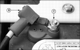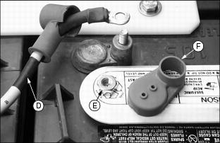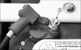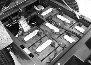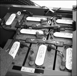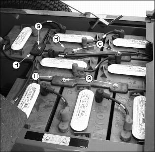4. Visually inspect all batteries for: · Discolored or melted terminal boots. · Dirt or corrosion on or around the battery terminals. · Damage to battery case or terminals. 5. Tighten battery terminal connections if a problem is detected. 6. Tighten battery hold downs if they are determined to be loose. 7. Clean battery compartment, terminal connections, cable ends and battery(s) if necessary. 8. If necessary, replace any damaged battery(s) and place in an acid resistant container until the battery can be properly disposed of. 9. Check battery electrolyte levels if necessary. Tighten Battery Terminal Connections1. Park vehicle safely. (See Park Safely in the Safety section.) NOTE: Turn off all vehicle electric accessories. 2. Raise and tilt operator seat forward. · Move the service/drive switch (A) to the SERVICE position. 4. Lift and secure cargo box in the raised position. 5. Clean battery compartment, terminal connections, cable ends and battery(s) if necessary. 6. Pull the boots (B) on the terminal cables back far enough to expose each terminal connection. 7. Use insulated tools to tighten each terminal connection hex nut (C) to 14-16 N·m (124-142 lb.-in.). 8. Install the proper terminal boots (B) (red on positive and black on negative) securely over each battery terminal. 11. Move the service/drive switch to the DRIVE position. Tighten Battery Hold Downs1. Park vehicle safely. (See Park Safely in the Safety section.) 2. Raise and tilt operator seat forward. · Move the service/drive switch (A) to the SERVICE position. 4. Lift and secure cargo box in the raised position. 5. Use insulated tools to tighten each battery hold down bolt (B) to 7-9 N·m (62-80 lb.-in.). 8. Move service/drive switch to the DRIVE position. Cleaning or Replacing BatteriesCleaning BatteriesCleaning is a key element in battery maintenance, for both safety and performance. Regular cleaning will reduce dirt and corrosion from forming. This reduces the chance of acid contact, and will provide efficient electrical connections. Lack of cleaning can cause the following problems: · Reduced reliability and performance. · Shortened overall battery life. 1. Park vehicle safely. (See Park Safely in the Safety section.) NOTE: Turn off all vehicle electric accessories. 2. Raise and tilt operator seat forward. · Move the service/drive switch (A) to the SERVICE position. 4. Lift and secure cargo box in the raised position. 5. Wash down batteries, battery terminals and battery compartment. If battery corrosion is excessive, additional cleaning of the battery(s) and surrounding area may be necessary. 6. Note the position of each battery in the battery compartment and the location of both the positive and negative terminals. 7. Using insulated tools, remove battery pack POSITIVE (+) cable (B) labeled "B+" and wire from positive terminal on battery labeled number "1" in the diagram. 8. Clean all moisture and corrosion in battery compartment with a solution of one part baking soda to five parts water. Rinse with clean water and allow to dry. 9. Pull the boots (C) on the terminal cables back far enough to expose each terminal for cleaning. NOTE: Battery positive "+" and negative "-" connections are marked and color coded. Battery cables are of specific length and labeled for each connection. See Battery Position and Connection Diagram in this section or refer to the safety/diagram label attached to the front of the vehicle cargo box the for proper installation. 10. Remove cables (D) from battery terminals that are corroded. · Loosen and remove hex nut (E). · Remove rubber post cover (F). 11. Remove corrosion from battery terminals and cable ends. · Clean battery terminals and cable ends with a solution of one part baking soda to five parts water. Use a wire brush if additional cleaning is required. · Rinse all parts with clean water and allow to dry. Replacing Batteries· Remove battery hold down bolts (G). · Remove battery hold down(s) (H). · Carefully lift the battery out of the vehicle. Store the battery until it can be properly disposed of. · Clean plastic battery tray and battery hold downs if corroded or rusty. · If necessary, remove battery tray and check vehicle supports for corrosion. · Clean area with a solution of one part baking soda to five parts water. · Rinse area with clean water and allow to dry. 2. Paint areas affected by rust or corrosion with acid resistant paint. 3. Install batteries in the same position and orientation as shown in the Battery Position/Connection diagram. (See Position and Connection Diagram in this section or diagram attached to the front of the cargo box.) 4. Install battery cables using the Battery Position/Connection diagram as reference. · Install rubber post cover (F).