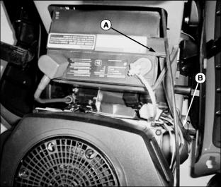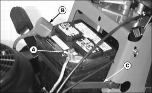 Removing:1. Park machine safely, (See Parking Safely in the Safety Section), and lift hood. 2. Disconnect negative (-) battery cable (A). 3. Push red cover (B) away from positive (+) battery cable and remove cable from battery. 4. Remove black rubber strap (C). Installing:If installing original battery, follow removal steps in reverse order. If installing replacement battery, use the following procedure. Installing Replacement Battery (Service Part #TY6191)NOTE: The replacement battery is different than the battery that comes with your machine. Be sure you have all the necessary parts to install the replacement battery. 1. Install battery cap, so that the drain is on the negative (-) terminal side of the battery. 2. Place charged battery on battery tray. 3. Install drain hose on battery cap (A) using a small hose clamp. See your John Deere dealer to order drain hose (M78562) and clamp (TY22462). 4. Route hose along the outside of the frame and in front of the left foot rest support (B). 5. Fasten hose to hole in foot rest support with tie strap (C). 6. Follow removal steps in reverse order to secure and connect battery. Clean Battery and Terminals