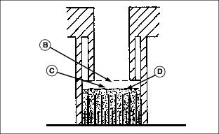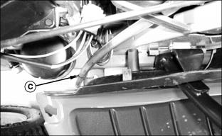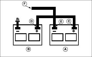 2. Check electrolyte level. Electrolyte level (C) should be 6 mm (1/4 in.) above plates (D) and below filler neck (B). 3. Add distilled water if necessary. 5. Tighten battery cable hardware. Removing and Installing the Battery