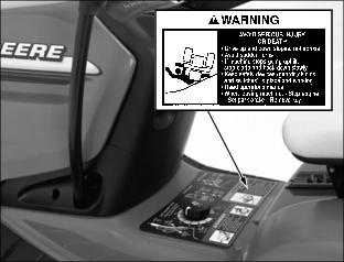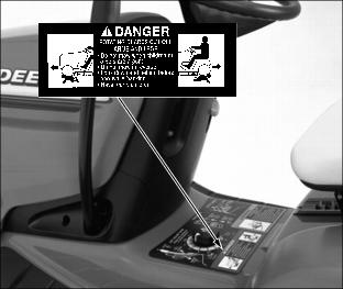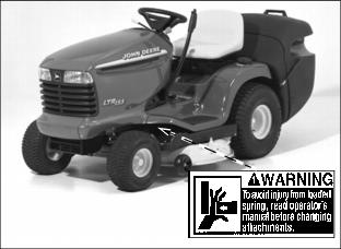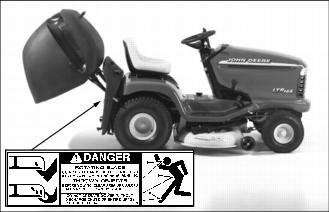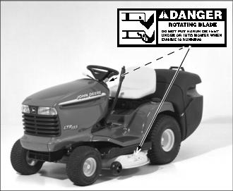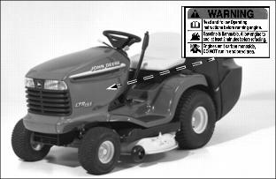 SafetyUnderstanding The Machine Safety LabelsThe machine safety labels shown in this section are placed in important areas on your machine to draw attention to potential safety hazards. On your machine safety labels, the words DANGER, WARNING, and CAUTION are used with this safety-alert symbol,. DANGER identifies the most serious hazards. The operator's manual also explains any potential safety hazards whenever necessary in special safety messages that are identified with the word, CAUTION, and the safety-alert symbol,. WARNING: AVOID SERIOUS INJURY OR DEATHˇ Drive up and down slopes, not across. ˇ If machine stops going uphill, stop blade and back down slowly. ˇ Keep safety devices (guards, shields, and switches) in place and working. ˇ When leaving machine: Stop engine, Set park brake, Remove key. DANGER: ROTATING BLADES CUT OFF ARMS AND LEGSˇ Do not mow when children or others are around. ˇ Look down and behind before and while backing. ˇ Never carry children even with the blades off. WARNINGPicture Note: Label is located on Right-Hand Side of Tractor Frame ˇ To avoid injury from loaded spring, read Operator's Manual before changing attachment. WARNINGPicture Note: Label is located on Left-Hand Side of Briggs and Stratton Engine ˇ Read and follow Operating Instructions before running engine. ˇ Gasoline is flammable. Allow engine to cool at least 2 minutes before refueling. ˇ Engines emit carbon monoxide, DO NOT run in enclosed area. DANGER: SHIELD EYES-EXPLOSIVE GASES CAN CAUSE BLINDNESS OR INJURYPicture Note: Label is located on battery ˇ Sulfuric acid can cause blindness or severe burns. CAUTION: FLUSH EYES IMMEDIATELY WITH WATER ˇ Keep out of reach of children. ˇ Keep vent caps tight and level. DANGER: ROTATING BLADEPicture Note: Two decals, one on each side of mower deck. ˇ Do not put hands or feet under or into mower when engine is running. DANGER: ROTATING BLADE-THROWN OBJECTSPicture Note: Decal is located to the right of discharge chute opening. ˇ Do not put hands or feet under or into mower when engine is running. ˇ Before mowing, clear area of objects that may be thrown by blade. ˇ Do not operate mower without discharge chute or entire grass catcher in place. Emission Control System Certification LabelNOTE: Tampering with emission controls and components by unauthorized personnel may result in severe fines or penalties. Emission controls and components can only be adjusted by EPA and/or CARB authorized service centers. Contact your John Deere Commercial and Consumer Equipment Retailer concerning emission controls and component questions. The presence of an emissions label signifies that the engine has been certified with the United States Environmental Protection Agency (EPA) and/or California Air Resources Board (CARB). The emissions warranty applies only to those engines marketed by John Deere that have been certified by the EPA and/or CARB; and used in the United States and Canada in off-road mobile equipment. Emission Compliance PeriodIf your engine has the emission compliance category listed on the emission control system certification or air index label, this indicates the number of operating hours for which the engine has been certified to meet EPA and/or CARB emission requirements. The following table provides the engine compliance period in hours associated with the category found on the certification label. CertificationYour mower has been certified by an independent laboratory for compliance with American National Standard B-71.1, "Safety Specifications" for Power Lawn Mowers, Lawn and Garden Tractors, and Lawn Tractors. Operating Safelyˇ Inspect machine before you operate. Be sure hardware is tight. Repair or replace damaged, badly worn, or missing parts. Be sure guards and shields are in good condition and fastened in place. Make any necessary adjustments before you operate. ˇ Check brake action before you operate. Adjust or service brakes as necessary. ˇ Stop machine if anyone enters the area. ˇ If you hit an object, stop the machine and inspect it. Make repairs before you operate. Keep machine and attachments properly maintained and in good working order. ˇ Do not leave machine unattended when it is running. ˇ Only operate during daylight or with good artificial light. ˇ Be careful of traffic when operating near or crossing roadways. ˇ Do not wear radio or music headphones while operating the machine. Safe operation requires your full attention. ˇ Older adults are involved in a large percentage of riding mower accidents involving injury. These operators should evaluate their ability to operate a mower safely enough to protect the operator and others from serious injury. Checking Mowing Areaˇ Clear mowing area of objects that might be thrown. Keep people and pets out of mowing area. ˇ Study mowing area. Set up a safe mowing pattern. Do not mow where traction or stability is doubtful. ˇ Test drive area with mower lowered but not running. Slow down when you travel over rough ground. Parking Safely1. Stop machine on a level surface, not on a slope. 3. Lower attachments to the ground. 7. Wait for engine and all moving parts to stop before you leave the operator's seat. Rotating Blades are DangerousHELP PREVENT SERIOUS OR FATAL ACCIDENTS:ˇ Rotating blades can cut off arms and legs. ˇ Keep hands, feet and clothing away from mower deck when engine is running. ˇ Be alert at all times, drive forward carefully. People, especially children can move quickly into the mowing area before you know it. ˇ Before backing up, shut off PTO and look behind the machine carefully, especially for children. ˇ Shut off blades when you are not mowing. ˇ Do not operate machine if you are under the influence of drugs or alcohol. ˇ Park machine safely before inspecting or unplugging mower or bagger. PROTECT CHILDREN:ˇ Never assume that children will remain where you last saw them. Children are attracted to mowing activity, stay alert to the presence of ch