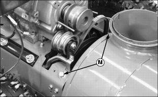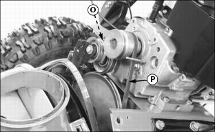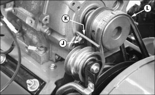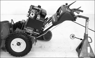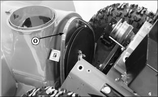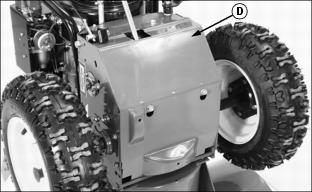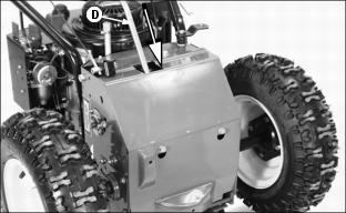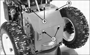13. Remove two cap screws (M). 14. Place a support (N) under handlebars and slowly lean back engine frame. 15. Lean back engine frame only far enough to expose the auger drive belt. 16. Put handle bars on support (N). 17. Remove auger drive belt (O) and install new belt. 18. Put unit back together and tighten two cap screws. 19. Install auger drive belt onto engine drive sheave. 20. Check auger drive belt tension and adjust if necessary. 21. Install belt guide and hardware. 22. Install belt cover and hardware. 23. Install discharge chute assembly and connect chute crank rod. Changing Traction Drive Belt1. Park snowblower on a hard, smooth surface. 2. Stop engine, remove key, wait for all moving parts to stop. 3. Remove wire from spark plug to prevent accidental starting. 5. Tip machine forward onto housing (A). 6. Remove two bolts (B) and loosen two bolts (C) to remove access panel (D). This will prevent the access panel from being bent when unit is split. 7. Tip unit back to it's normal position. 8. Remove quick pull pin (E) and remove chute crank rod (F). 9. Remove both cap screws and lock nuts (G), lay discharge chute assembly off to the right side of the unit. 10. Remove two cap screws (I) to remove belt cover (H). 11. Loosen cap screw (J) just enough to loosen belt guide (K). 12. Move belt guide enough to remove auger drive belt (L) from engine drive sheave.