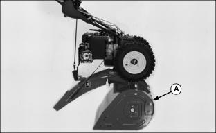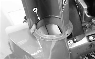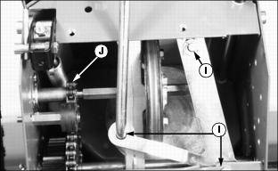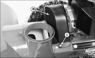 7. Apply grease to hex shaft (F), pinion shaft grease fitting (G) and both drive axle grease fittings (H). 8. Lightly apply oil to shift lever arm pivot points (I) and drive chain (J). 9. Install access panel (D) and tighten hardware. Lubricating Discharge ChuteTurn discharge chute while applying grease to base (A). Changing Auger Drive Belt1. Park snowblower on a hard, smooth surface. 2. Stop engine, remove key, wait for all moving parts to stop. 3. Remove wire from spark plug to prevent accidental starting. 5. Tip machine forward onto housing (A). 6. Remove two bolts (B) and loosen two bolts (C) to remove access panel (D). This will prevent the access panel from being bent when unit is split. 7. Tip unit back to it's normal position. 8. Remove quick pull pin (E) and remove chute crank rod (F). 9. Remove both cap screws and lock nuts (G), lay discharge chute assembly off to the right side of the unit. 10. Remove two cap screws (I) to remove belt cover (H). 11. Loosen cap screw (J) just enough to loosen belt guide (K). 12. Move belt guide enough to remove auger drive belt (L) from engine drive sheave.
