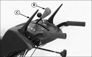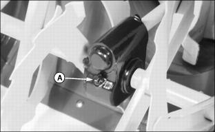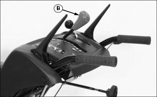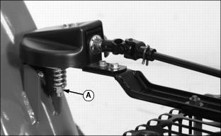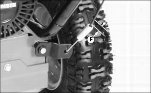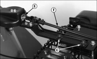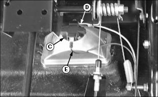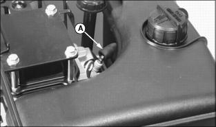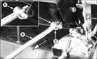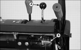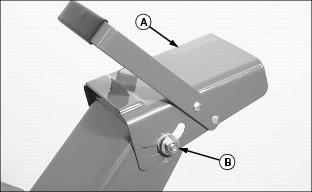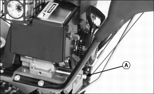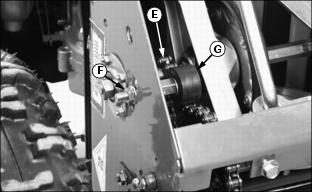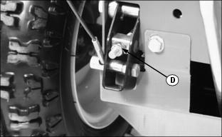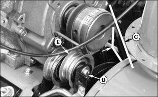 13. Remove two cap screws (M). 14. Place a support (N) under handlebars and slowly lean back engine frame. 15. Lean back engine frame only far enough to expose the auger drive belt. 16. Put handle bars on support (N). 17. Pull back spring loaded idler (O) and remove traction drive belt (P) from engine drive sheave. Install new belt. 18. Put unit back together and tighten two cap screws. 19. Install auger drive belt onto engine drive sheave. 20. Check auger drive belt tension and adjust if necessary. 21. Install belt guide and hardware. 22. Install belt cover and hardware. 23. Install discharge chute assembly and connect chute crank rod. Adjusting Auger Drive Belt Tension1. Park snowblower on a hard, smooth surface. 2. Stop engine, remove key, wait for all moving parts to stop. 3. Remove wire from spark plug to prevent accidental starting. 4. Remove two cap screws (A) to remove belt cover (B). 5. Hold down the auger drive lever in the engaged position while checking belt tension. 6. Check drive belt deflection (C). Belt should deflect a little with moderate thumb pressure. · Move pulley (E) toward belt to tighten or away to loosen. Hold pulley and tighten nut. 8. Check belt deflection again. · When the drive belt is properly tensioned, cable spring should extend approximately 9.5 mm (3/8 in.) (F), with auger drive lever engaged. · When the auger drive lever is disengaged, pulley (E) should drop away from the drive belt. 9. Install belt cover and two cap screws. Adjusting Chute Crank1. Park snowblower on a hard, smooth surface. 2. Stop engine, remove key, wait for all moving parts to stop. 3. Remove wire from spark plug to prevent accidental starting. · If chute crank is too loose, tighten nut (A). · If chute crank is too tight, loosen nut (A). Checking Clutch / Impeller Brake1. Park snowblower on a hard, smooth surface. 2. Stop engine, remove key, wait for all moving parts to stop. 3. Remove wire from spark plug to prevent accidental starting. 5. Tip machine forward onto housing (A). 6. Remove two bolts (B) and loosen two bolts (C) to remove access panel (D). 7. Check clearance (H) between brake pad (G) and auger drive belt (I) on auger drive sheave (F): · With auger drive lever engaged, clearance (H) should be approximately 1.5 mm (1/16 in.). · With auger drive lever released, the brake pad (G) must contact auger drive belt (I). 8. If proper clearance can not be obtained see your John Deere Dealer. Adjusting Chute Deflector Lever- Models 1128DE, 1128DDE and 1332DDE1. Park snowblower on a hard, smooth surface. 2. Stop engine, remove key, wait for all moving parts to stop. 3. Remove wire from spark plug to prevent accidental starting. 4. Check chute deflector lever (A) and adjust if necessary. 5. Adjust chute deflector lever: · If lever is too loose, tighten nut (B). · If lever is too tight, loosen nut (B). Adjusting Chute Deflector - Model 924DE1. Park snowblower on a hard, smooth surface. 2. Stop engine, remove key, wait for all moving parts to stop. 3. Remove wire from spark plug to prevent accidental starting. 4. Check chute deflector (A) and adjust if necessary. · If chute deflector is too loose, tighten nut (B). · If chute deflector is too tight, loosen nut (B). Adjusting Traction Drive ClutchAdjust traction clutch to compensate for wear of friction wheel when slippage occurs. 1. Park snowblower on a hard, smooth surface. 2. Stop engine, remove key, wait for all moving parts to stop. 3. Remove wire from spark plug to prevent accidental starting. 5. Tip machine forward onto housing (A). 6. Put speed selector lever (B) in FIRST gear. 7. With traction clutch lever (C) disengaged, turn drive wheels by hand. Tighten adjustment nut (D) until wheels begin to drag. 8. Engage and release traction clutch lever (C) to align clutch linkage. 9. Repeat procedure as necessary. 10. When wheel drag is obtained with linkage alignment, loosen adjustment nut (D) a full three turns. Drive wheels will then turn freely. Adjusting Speed / Shift Linkage1. Park snowblower on a hard, smooth surface. 2. Stop engine, remove key, wait for all moving parts to stop. 3. Remove wire from spark plug to prevent accidental starting. 5. Tip machine forward onto housing (A). 6. Move speed selector lever (B) to the "6" (6th gear) position. 7. Locate shift rod under operator control panel. 8. Remove quick pull pin (C) from shift rod (D) and remove shift rod assembly from shift lever linkage. 9. Push shift rod (D) into housing as far as it will go and hold it in this position until rod adjustment is made. 10. Turn adjusting link (E) until stud aligns with hole in shift linkage. 11. Install shift rod (D) into shift lever linkage and install quick pull pin (C). 12. Return unit to its operating position. 13. Start engine and check for proper operation of the speed selector lever (B). Adjusting Drive Chain1. Park snowblower on a hard, smooth surface. 2. Stop engine, remove key, wait for all moving parts to stop. 3. Remove wire from spark plug to prevent accidental starting. 5. Tip machine forward onto housing (A). 6. Remove two bolts (B) and loosen two bolts (C) to remove access panel (D). 7. Drive chain (E) should be taut with little or no play in it. 8. To adjust chain tightness: Loosen nut (F) and move chain tensioner (G) up or down in slot as necessary. Filling Fuel TankUse regular grade 87 octane unleaded fuel. Add John Deere fuel stabilizer to fuel before using it in your machine to prevent engine damage due to stale fuel. Follow directions on stabilizer container. 1. STOP engine, let it cool several minutes before you add fuel. 2. Remove dirt and debris from tank area. 4. Fill tank with fuel only to bottom of filler neck. Cleaning Fuel Cap Vents· Clean in nonflammable solvent. Changing Headlight Light Bulb1. Stop engine, remove key, wait for all moving parts to stop. 2. On Models 1128DE, 1128DDE and 1332DDE, move chute deflector lever (A) to the rear. 3. Move shift lever (B) to the "R2" position. NOTE: It is n