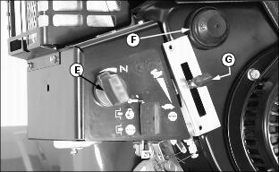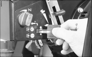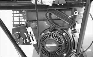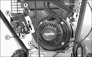 To check unit for a frozen impeller (A):1. Disconnect spark plug wire from spark plug. 3. Pull engine rewind starter. If impeller is frozen: Rewind starter can not be pulled. Move unit to a heated area so ice around impeller can thaw. If Impeller is not frozen: Rewind starter can be pulled - it will be more difficult than normal. Starting Engine1. Check fuel shut off valve (A). Valve must be in the full open position. 2. Traction drive lever (B) and auger drive lever (C) must be in the DISENGAGED position. 3. Speed selector lever (D) should be in the "N" NEUTRAL position. NOTE: The engine ignition key is a two position PUSH/PULL design. DO NOT twist key after it is installed. 4. Install engine ignition key and PUSH it into the "START" position. ˇ "START" position. To enable the ignition system, push key all the way in until you feel it "Click" into place. ˇ "STOP" position. To disable the ignition system, pull key all the way out. 5. Turn choke control knob (E) to choke engine. This engine is equipped with a three position choke: ˇ Cold engine: Turn choke knob clockwise to the full position. ˇ Warm / Hot engine: Turn choke knob to the off position or the middle position, depending on engine temperature. 6. Push primer bulb (F) to force fuel into the carburetor, be sure to cover vent hole in primer bulb: ˇ Cold engine: Push primer bulb quickly two or three times. When temperatures go below -10° C (15° F) repeat priming may be needed. ˇ Warm / Hot engine: Push primer bulb once or not at all depending on engine temperature. 7. Move throttle lever (G) to set engine speed: ˇ Cold engine: Set throttle lever at 1/2 to 3/4 fast position. ˇ Warm / Hot engine: Set throttle lever in the slow position. a. Pull starter handle (H) until you feel resistance within the engine. b. Then pull handle fast and steady. c. Do not let handle snap back. d. Repeat steps 6 and 8 until engine starts. If starter handle is frozen and will not crank engine: a. Pull as much rope out of starter as possible. b. Release starter handle and let it snap back against starter, repeat as required.