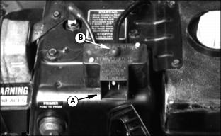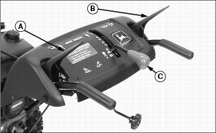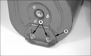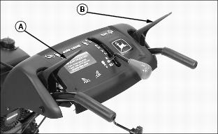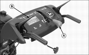 ˇ The speed selector lever (A) controls the units forward speed and reverse motion. ˇ Moving the speed selector lever forward increases forward travel. There are six forward speeds available: "1" is the slowest speed and "6" is the fastest speed. ˇ Moving the speed selector lever rearward increases reverse travel. There are two reverse speeds available: "R1" is the slowest speed and "R2" is the fastest speed. To Operate Speed Selector Lever:ˇ With engine running, position speed selector lever in the notch of the desired speed and ENGAGE the traction drive lever (B). ˇ Forward speed can be changed without decollating (releasing traction drive lever). ˇ DO NOT change motion from forward to reverse with traction drive lever ENGAGED. ˇ Release traction drive lever to STOP forward or reverse travel. ˇ Drive wheel slippage will occur as the traction drive wheel wears. Using Discharge Chute Controls