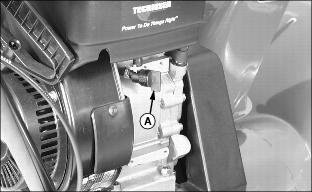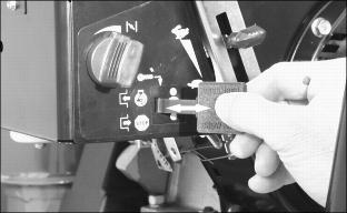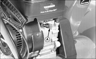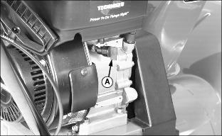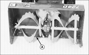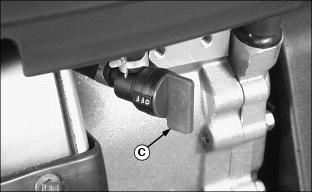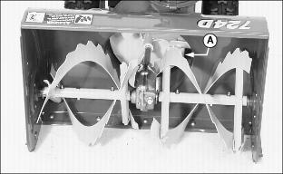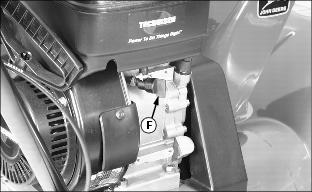 NOTE: The electric starter motor will shut off automatically if it overheats from cranking the engine. After the motor cools, it will operate again. 1. Connect power cord to engine switch box (A). 2. Plug other end of cord into three-hole, grounded 120-volt AC. receptacle. 3. Push starter button (B) to start engine. 4. Disconnect cord from house circuit first. Then disconnect cord from switch box. ˇ Slowly move choke knob to the off position. ˇ Slowly move throttle lever to desired engine speed. Stopping EngineFollow steps below before you park, inspect, adjust, or unplug snowblower. 1. Release traction drive lever (A) and auger drive lever (B): 2. Put speed selector lever (C) in the "N" NEUTRAL position. 3. Slowly move throttle lever (D) to the "STOP" position. Engine will stop. NOTE: The engine ignition key is a two position PUSH/PULL design. DO NOT twist key after it is installed. 4. Pull engine ignition key out. ˇ "START" position. To enable the ignition system, push key all the way in until you feel it "Click" into place. ˇ "STOP" position. To disable the ignition system, pull key all the way out. 5. Move fuel shut off valve (F) to the CLOSED (OFF) position. Using Fuel Shut OffThe engine in your snowblower is equipped with a two position fuel shut off valve (A). ˇ When performing any type of engine service. ˇ Fuel shut off valve must be in the full OPEN position for proper fuel delivery to the engine. Emergency StoppingTo stop snowblower in an emergency, release levers. ˇ Stop auger. If the auger does not come to a complete stop in 5 seconds or less after the auger drive lever is released. Engine will not stop. Remove engine ignition key to stop engine. TransportingTransporting A Short Distance:ˇ When transporting unit to and from area to be cleared, press down on handlebars enough to raise front of snowblower slightly off surface. ˇ Engage traction drive lever to propel unit. Do not engage auger drive while transporting. Transporting A Long Distance:ˇ When transporting this snowblower on a trailer or in a truck, make sure unit is secured to prevent it from sliding or tipping over. ˇ Move fuel shut off valve (A) to the closed (OFF) position. Snowblowing Tipsˇ For best snowblower performance, run engine with throttle lever in the fast position. ˇ Do not operate unit at high transport speeds on slippery surfaces and use care when backing. ˇ Do not overload machine capacity by attempting to clear snow at too fast a rate. ˇ Match ground speed to amount of snow to be moved. Example: Low speed (1) is recommended for removing deep or hard packed snow. ˇ Clear snow immediately after it falls, if possible. ˇ Blow snow downwind, if possible. ˇ Overlap each swath slightly for complete snow removal. ˇ Run snowblower a few minutes after blowing snow to prevent freeze up of auger/impeller. ˇ Pull the starter handle several times to help prevent moisture in the starter from freezing. |