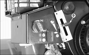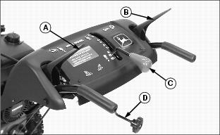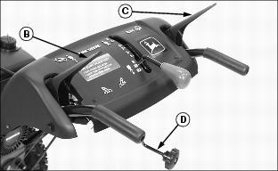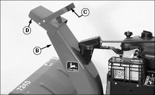 DISCHARGE CHUTEˇ The discharge chute control (A) will rotate the discharge chute (B). ˇ The discharge chute will rotate (full right, straight ahead, or full left). ˇ If discharge chute is too difficult to rotate or is too loose. Chute Deflectorˇ The chute deflector lever (C) will assist in positioning the chute deflector (D): ˇ The chute deflector will determine how high or low snow will be thrown. ˇ If the chute deflector becomes difficult to move or is too loose. Pre-Starting Engine