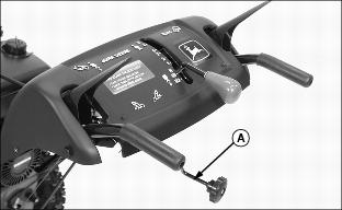OperatingDaily Operating ChecklistAvoid Damage to Plastic and Painted Surfacesˇ Do not wipe plastic parts unless rinsed first. ˇ Be careful not to spill fuel on machine. Fuel may damage surface. Wipe up spilled fuel immediately. Engine ControlsConsole ControlsAdjusting Scraper Blade1. Park snowblower on a hard, smooth surface. 2. Stop engine, remove key, wait for all moving parts to stop. 3. Remove wire from spark plug to prevent accidental starting. 4. Tip unit back onto handle bars and support housing. 5. Adjust skid shoes to their full up position. ˇ If scraper blade has excessive wear, replace it. ˇ If scraper blade can be adjusted; loosen nuts and reposition scraper blade, flush with skid shoes. 8. Adjust skid shoes to the proper height. Adjusting Skid ShoesAdjust skid shoe height for proper working conditions:ˇ To operate on a smooth, hard surface: Adjust skid shoes so there is 3mm (1/8 in.) between scraper blade and surface. ˇ To operate on gravel or uneven surface: Adjust skid shoes so there is 30mm (1-1/4 in.) between scraper blade and surface. ˇ To operate on hard packed snow: Remove skid shoes and install them upside down. This will prevent the snowblower from riding up on the snow. Adjust skid shoes so there is 3mm (1/8 in.) between scraper blade and surface. 1. Park snowblower on a hard, smooth surface. 2. Stop engine, remove key, wait for all moving parts to stop. 3. Remove wire from spark plug to prevent accidental starting. ˇ Air pressure in both tires should be equal, although some machine leveling can be made by using different pressures. Check for a maximum of 165 kPa (24 psi) in each tire. ˇ Each tire must be resting on hard surface, not a cross-link of tire chain. 5. Put a block under auger housing. ˇ If skid shoes have excessive wear, replace them. ˇ If skid shoes can be adjusted; loosen two nuts (A) and move skid shoe (B) to desired position. 7. Tighten nuts. Adjust other skid shoe to the same height. Using Drive Control LeversTraction Drive Lever (A):ˇ Pull lever (A) to handle to engage the traction drive. ˇ Release lever to disengage traction drive. ˇ Traction drive lever (A) works independently from the auger drive lever (B). ˇ If unit does not respond, is slow to respond or engages too aggressively when the traction drive lever is engaged, adjust traction drive clutch. Auger Drive Lever (B):ˇ Pull lever (B) to handle to engage the auger drive. ˇ Release lever to disengage auger drive. ˇ Auger drive lever (B) works independently from the traction drive lever (A). ˇ If auger is not throwing snow very well or it feels like the auger drive belt is slipping when the auger drive lever is engaged, adjust auger drive belt tension. ˇ If the auger does not come to a complete STOP in 5 seconds or less after the auger drive lever is released, adjust impeller / auger brake. Using Speed Selector Lever