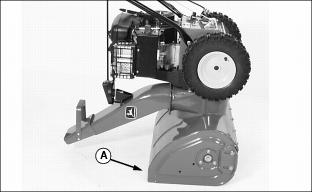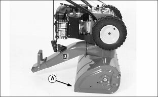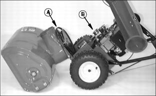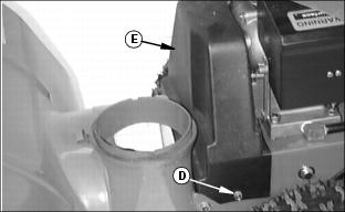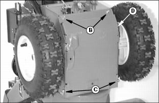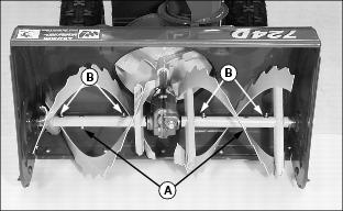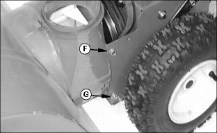 · Wheel drive spring assembly (F). Lubricating Discharge ChuteDischarge chute should be lubricated at the beginning of season or every 25 operating hours. · Turn discharge chute while applying grease to base (A). Changing Friction Wheel1. Park snowblower on a hard, smooth surface. 2. Stop engine, remove key, wait for all moving parts to stop. 3. Remove wire from spark plug to prevent accidental starting. 4. Tip machine forward onto housing (A). 5. Remove two bolts (B) and loosen two bolts (C) to remove access panel (D).