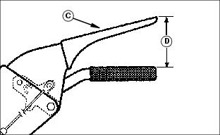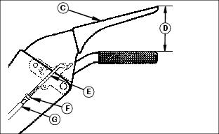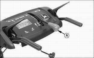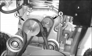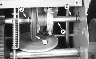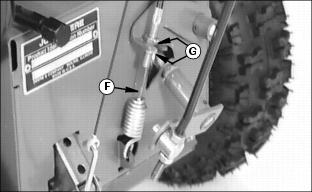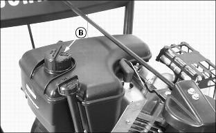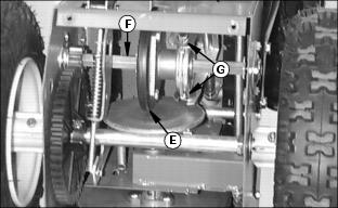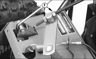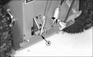 6. Remove right hand wheel and tire. 7. Remove bearing flange on right side of frame 8. Slide friction wheel assembly (E) and hex shaft (F) to the right until left end of hex shaft comes free of the left bearing and pinion. 9. Remove three cap screws securing friction wheel to hub and remove friction wheel. 10. Secure new friction wheel onto hub with three cap screws. Tighten cap screws to 11-13 N·m (8-10 lb-ft). 11. Position friction wheel hub in forks (G). Be sure washers are in place on bearing flange pins. Slide hex shaft to left and into pinion and left bearing with flat washers in position. Pinion gear must mesh with large gear. 12. Install bearing flange and right hand tire and wheel. Changing Auger Drive Belt Or Traction Drive Belt1. Park snowblower on a hard, smooth surface. 2. Stop engine, remove key, wait for all moving parts to stop. 3. Remove wire from spark plug to prevent accidental starting. 4. Disconnect auger chute rotation linkage: · Remove 1/4 x 1-1/4 cap screw (A), Lock washer, Flat washer and spacer. · Remove 5/16 x 5/8 cap screw (B), Lock washer and Flat washer. · Lift discharge chute (C) off housing. 5. Remove two cap screws (D) to remove belt cover (E). 6. Disconnect belts from engine: 7. Loosen lower cap screws (G). 8. Support handle bars and remove upper cap screws (F). 9. Push down on handle bars. Unit will separate, put handle bars on floor. 10. Inspect drive belts. Remove and replace belts as required. Assemble Unit1. Install upper and lower hardware (F and G). 2. Install drive belts on engine. 4. Install discharge chute and connect auger linkage. Adjusting Chute Crank1. Park snowblower on a hard, smooth surface. 2. Stop engine, remove key, wait for all moving parts to stop. 3. Remove wire from spark plug to prevent accidental starting. · If chute crank is too tight, loosen nut (A). · If chute crank is too loose, tighten nut (A). Adjusting Chute Deflector1. Park snowblower on a hard, smooth surface. 2. Stop engine, remove key, wait for all moving parts to stop. 3. Remove wire from spark plug to prevent accidental starting. · If chute deflector is too loose, tighten nut (A). · If chute deflector is too tight, loosen nut (A). Adjusting Impeller / Auger Brake1. Park snowblower on a hard, smooth surface. 2. Stop engine, remove key, wait for all moving parts to stop. 3. Remove wire from spark plug to prevent accidental starting. 4. Remove two cap screws (A) to remove belt cover (B). 5. Check clearance between brake pad (C) and auger drive belt (D): · With auger drive lever released, the brake pad (C) must contact auger drive belt (D). NOTE: When the auger drive cable has some slack in it; that means maximum spring force is being applied to the brake arm (E). 6. Check auger drive cable (F), cable should have some slack in it. If cable is tight or very loose, change cable length by adjusting nuts (G). Adjusting Auger Drive Belt Tension1. Park snowblower on a hard, smooth surface. 2. Stop engine, remove key, wait for all moving parts to stop. 3. Remove two cap screws (A) to remove belt cover (B). 4. Check impeller / auger brake adjustment before adjusting tension on the auger drive belt. 5. Start the engine and run at full throttle. 6. Slowly depress the auger drive lever (C) until the auger shaft begins to rotate. At this point the auger drive lever should be between 76 to 83 mm (3 to 3-1/4 in.) (D) from the handle grip. 7. If your dimension is not within this range, shut off the engine and adjust the auger drive belt tension as required. NOTE: A 1.5 mm (1/16 in.) adjustment of the pulley will result in an approximate 6 mm (1/4 in.) change in the measurement (D). 8. To adjust the belt tension, loosen the idler arm pulley lock nut (E) and move the pulley (F) to loosen or tighten the belt tension. 10. Repeat steps 5 through 8 until adjusted properly. Adjusting Traction Drive ClutchAdjust traction clutch to compensate for wear of friction wheel when slippage occurs. 1. Park snowblower on a hard, smooth surface. 2. Stop engine, remove key, wait for all moving parts to stop. 3. Remove wire from spark plug to prevent accidental starting. 4. Put speed selector lever (A) in first gear. 5. Pull the wheel drive clutch arm (B) upward until you feel a positive stop. Hold the wheel drive clutch arm in this position. 6. Move the traction drive lever (C) until it is 83 - 95 mm (31/4 - 3-3/4 in.) (D) from the handle grip. 7. With the wheel drive clutch arm (B) held upward and the traction drive lever held down to dimension (D) there should be no slack in cable (E), adjust the cable length as required: b. Lengthen or shorten cable (E) by turning adjusting sleeve (G). d. Repeat steps 5 - 7 until there is no slack in cable. Adjusting Speed / Shift Linkage1. Park snowblower on a hard, smooth surface. 2. Stop engine, remove key, wait for all moving parts to stop. 3. Remove wire from spark plug to prevent accidental starting. 4. Put speed selector lever (A) in reverse R2 position. 5. Tip machine forward onto housing (B). 6. Remove two bolts (C) and loosen two bolts (D) to remove access panel (E). 7. Loosen both lock nuts (F) on the shift lever linkage. 8. Slide hex shaft (H) to the right. Roll pin (G) will be up against the side frame. Hold shaft in the position. 9. Slide friction wheel (I) to the left until it is up against roll pin (J). 10. Tighten both lock nuts (F) on shift lever swivel. 11. Check to make sure friction wheel (I) is up against roll pin (J) and roll pin (G) is up against the side frame. 12. Check operation of shift lever linkage: · Shift lever in "R2", the friction wheel should contact roll pin (J). · Shift lever in "6", the friction wheel should not travel beyond the friction plate diameter. 13. Install access panel and return unit to its operating position. 14. Start engine and check for proper operation of the speed selector lever. Filling Fuel TankUse regular grade 87 octane unleaded fuel. Add John Deere fuel stabilizer to fuel before using it in your m