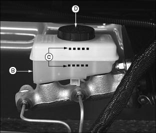 5. Unscrew dipstick (B) and remove it from the differential housing. 6. Add approximately 3.3 L (3.5 qt.) of oil through the dipstick opening. 7. Wipe dipstick dry with a clean cloth. NOTE: Do not tighten dipstick. Allow threads to rest on top of the dipstick opening. 9. Remove dipstick. Oil level should be at level (C) on the dipstick. · If oil is low, add oil. Oil level should be to the top of the XX area (B) on the dipstick. 10. Install and tighten dipstick. NOTE: Oil will flow very slowly through the front axle housing. Check oil level again after the first several hours of operation. Brake FluidThe following John Deere heavy duty brake fluid is PREFERRED for all drum and disc brakes: Other brake fluids may be used if the above John Deere brake fluid is not available and they provide the following: · Conforms to Motor Vehicle Safety Standard No. 116. · Minimum wet boiling point 140° C (284° F). · Minimum dry boiling point 232° C (450° F) to prevent vapor lock. Check Brake Fluid Level1. Park vehicle safely. (See Parking Safely in the Safety section.) 3. Visually check the see-through reservoir (B) for the appropriate amount of fluid. · Fluid levels must be maintained between the "MAX" maximum and "MIN" minimum fill lines (C). · If the fluid level is above the "MIN" minimum fill line, Do not open the cap. · Carefully clean area around reservoir cap (D). Unscrew cap. |