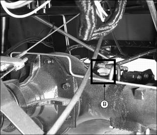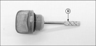 2. Unscrew dipstick (A) and remove it from axle. 3. Wipe dipstick dry with a clean cloth. NOTE: Do not tighten dipstick. Allow threads to rest on top of the axle housing. 4. Install dipstick into the axle housing. 5. Remove dipstick. Oil level should be at level (B) on the dipstick. · If oil is low, add oil. Oil level should be to the top of the XX area (B) on the dipstick. 6. Install and tighten dipstick. Changing the Front Axle Oil (4WD Models)1. Park vehicle safely. (See Parking Safely in the Safety section.) 2. Place container under the oil drain location. 3. Remove differential drain plug (A) to drain oil. 4. Install and tighten drain plug.
